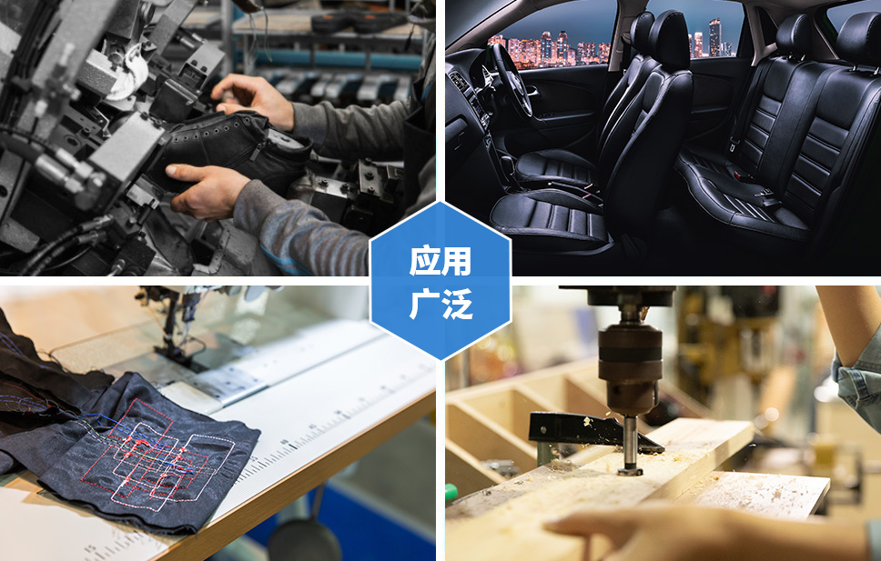 可廣泛適用于制鞋、箱包、皮件、服裝、帽業(yè)、木業(yè)、玩具、汽車(chē)內(nèi)飾、包裝、文具、吸塑、聚胺酯加工等行業(yè),產(chǎn)品深受客戶(hù)的青睞